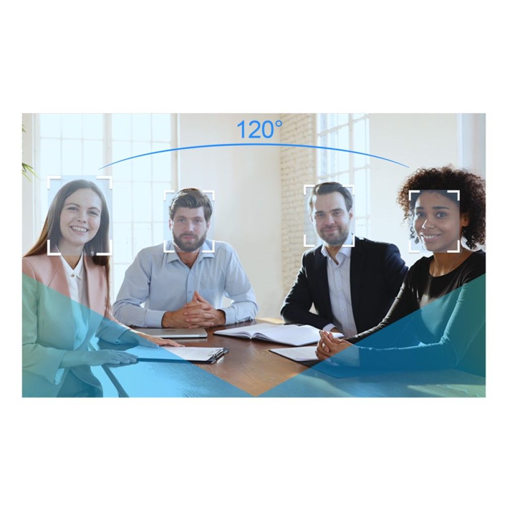 La barre vidéo tout en un Lumens MS-10 comprend une caméra UHD 4K grand-angle (120°) capable de zoomer jusqu'à 4x et de recadrer automatiquement l'image autour des participants, grâce à l'intelligence artificielle intégrée.